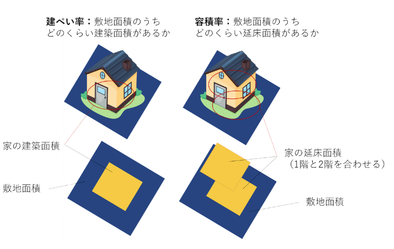 - 建ぺい率と容積率は建築基準法に定められている建築物の制限のこと